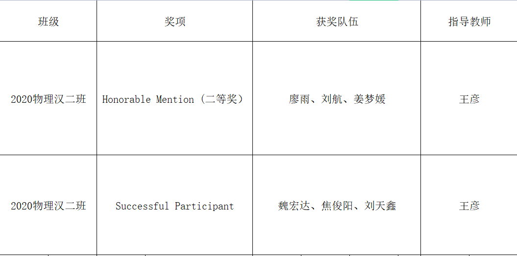 近日,2022年美国(国际)大学生数学建模竞赛(MCM/ICM)组委会公布成绩。我院王彦老师带领的的2支队伍参加比赛并荣获佳绩,其中1支队伍荣获2022年美国大学生数学建模竞赛二等奖(Honorable Mention),另外1支队伍荣获成功参赛奖(Successful Participant)。